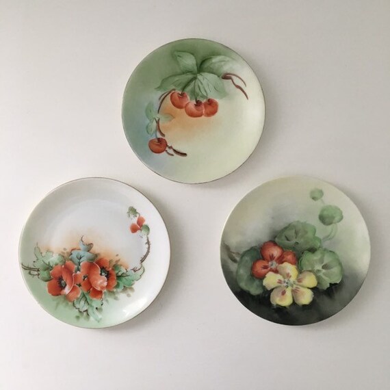 Antique Hand Painted Plates Set Of Three Vintage Floral Dishes Nasturtium Poppies Cherries Cottage Style Wall Decor Home Decor Gift Ideas